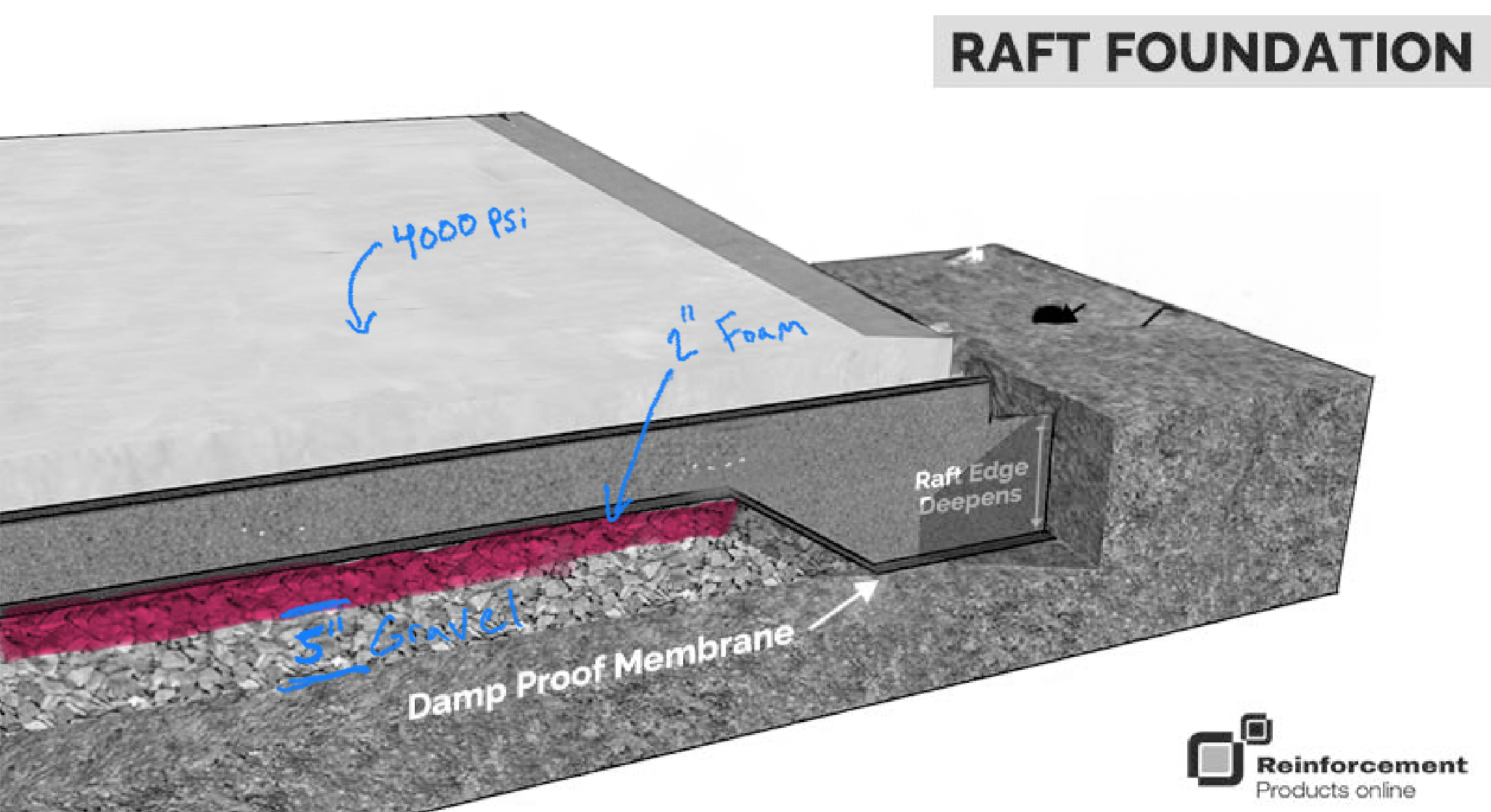 2” of Foam, 5” of gravel minimum of 4” Concrete and edges deepen to 12-18”. Concrete is a 4000 psi Exterior mix